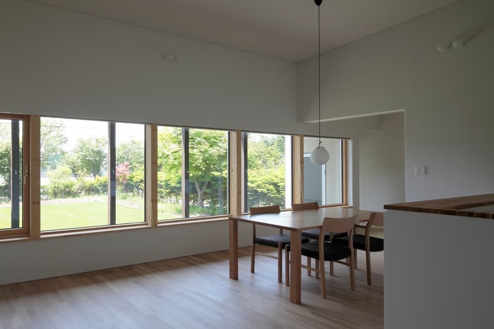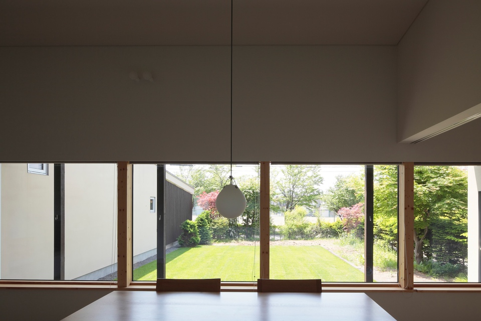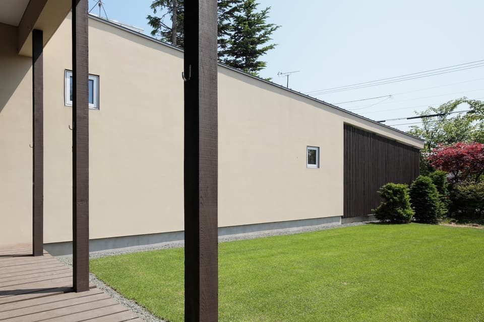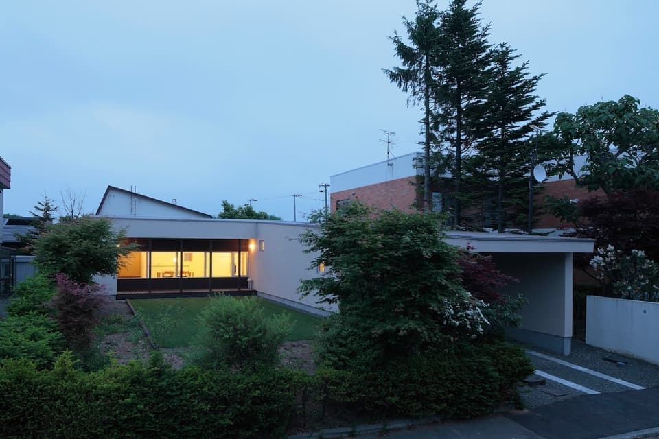家族3人が暮らす平屋の住宅である。1年以上、土地探しをしてやっと巡り会えたのは、約100 坪、古屋付の公園に面した南接道敷地であった。築40 年の古屋には立派な庭木と生け垣があり、近隣の庭とも一体感を作り出し、良いまちなみを形成しているように感じられた。一方、南接道の敷地では、長い玄関アプローチの除排雪に苦労されていることを近隣の方々から聞いた。既存の庭木を活かすことで昔から建っていたような落ち着いた雰囲気を作り出したいと考えた。また、公園や遊歩道に面した敷地環境を借景として家に取り込みたいと考えた。一方、長く安心して暮らせる家が求められた。そのため、住宅の基本性能の確保に加え、維持管理費の掛からないこと、除排雪の負担が少ないことが大切なテーマとした。住宅を既存の庭木や生け垣を活かすようにL 型に配置し、庭木と家による緩い囲み型の住宅配置とした。玄関を道路そばに配置し除雪範囲を最小限にし、中庭の奥にリビングを配置することで、開放的なリビングからは距離による安心感を確保しながら南に広がる公園の風景を取り込むことが可能となった。敷地の奥から道路に向かって緩い勾配屋根とすることで、LDKの天井は高く、玄関、車庫の天井は低くして空間的魅力と熱効率のバランスを計り、近隣の町並みとの調和を意識した。リビングは天井を高くし、単調になりがちな平屋の室内にメリハリを付けている。また、軒を出して縁側空間を設けることで道路からの距離感を確保するとともに、夏の日射をコントロールしている。