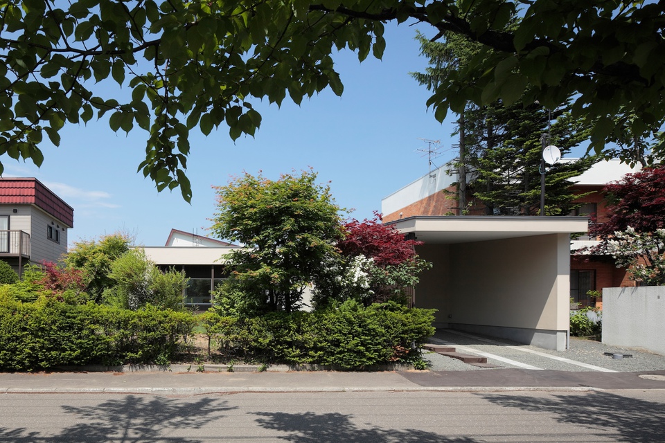家族3人が暮らす平屋の住宅である。1年以上、土地探しをしてやっと巡り会えたのは、約100 坪、古屋付の公園に面した南接道敷地であった。築40 年の古屋には立派な庭木と生け垣があり、近隣の庭とも一体感を作り出し、良いまちなみを形成しているように感じられた。一方、南接道の敷地では、長い玄関アプローチの除排雪に苦労されていることを近隣の方々から聞いた。既存の庭木を活かすことで昔から建っていたような落ち着いた雰囲気を作り出したいと考えた。また、公園や遊歩道に面した敷地環境を借景として家に取り込みたいと考えた。一方、長く安心して暮らせる家が求められた。そのため、住宅の基本性能の確保に加え、維持管理費の掛からないこと、除排雪の負担が少ないことが大切なテーマとした。住宅を既存の庭木や生け垣を活かすようにL 型に配置し、庭木と家による緩い囲み型の住宅配置とした。玄関を道路そばに配置し除雪範囲を最小限にし、中庭の奥にリビングを配置することで、開放的なリビングからは距離による安心感を確保しながら南に広がる公園の風景を取り込むことが可能となった。敷地の奥から道路に向かって緩い勾配屋根とすることで、LDKの天井は高く、玄関、車庫の天井は低くして空間的魅力と熱効率のバランスを計り、近隣の町並みとの調和を意識した。リビングは天井を高くし、単調になりがちな平屋の室内にメリハリを付けている。また、軒を出して縁側空間を設けることで道路からの距離感を確保するとともに、夏の日射をコントロールしている。