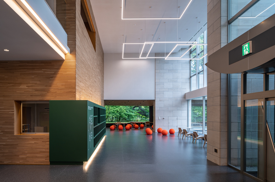 本計画は、北海道大学札幌キャンパスの中心に立つファカルティハウスエンレイソウの改修計画である。大学のファカルティハウスとして約30年間使用された建築をリノベーションし、研究者と企業・自治体等が議論しオープンイノベーションを創出する場へと転換を図っている。既存建築は、大学キャンパス内を南北に流れるサクシュコトニ川の水が流れ込む大野池に隣接し、キャンパス内でも特に豊かな自然に囲まれる場所に立地していた。大野池周辺の自然を堪能するように円弧状に平面が計画され、池に向かって傾斜する断面形状となっていた。またライムストーンや木練付仕上の壁など、自然素材で構成されていた。改修計画では、既存建築の持つ「敷地周辺の豊かな北海道大学キャンパスの自然要素との関係性」「上質な自然素材仕上」の特徴を活かしながら、空間構成要素を再編し「オープンイノベーションハブ」という新たな機能に対応するデザインを目指した。大野池に面するメインラウンジは、屋内外の連続性を高めるように屋外に向かって緩やかに傾斜するナラ材の木ルーバー天井をデザインした。レストランとラウンジとして個々に利用されていた空間に対しては、床レベルを揃え、壁をナラ材の木ルーバーとし共通のアイコンを施すことで、一体的な利用も可能な連続性を創出した。また、吹抜の天井からは、四角形が幾重にも重なる線状の照明をデザインしている。全体として、多様なアクティビティを受けとめるプラットフォームとなるよう、無彩色で素材感を感じられるものとしている。家具計画は、イノベーティブで多様なアクティビティを促進する装置として、利用者の気分を向上させるカラフルな色を用いて、様々な姿勢で利用可能で、組合せにより様々な人数やシーンに対応可能なものを選定した。