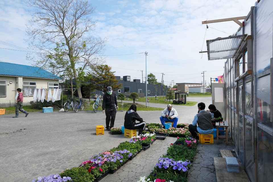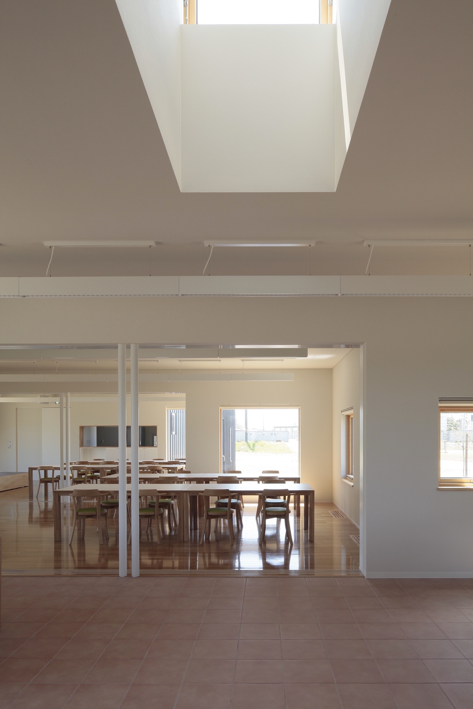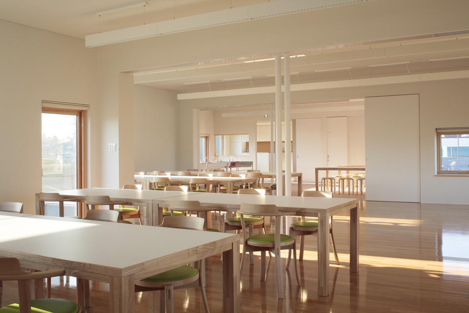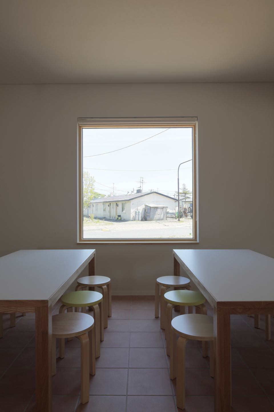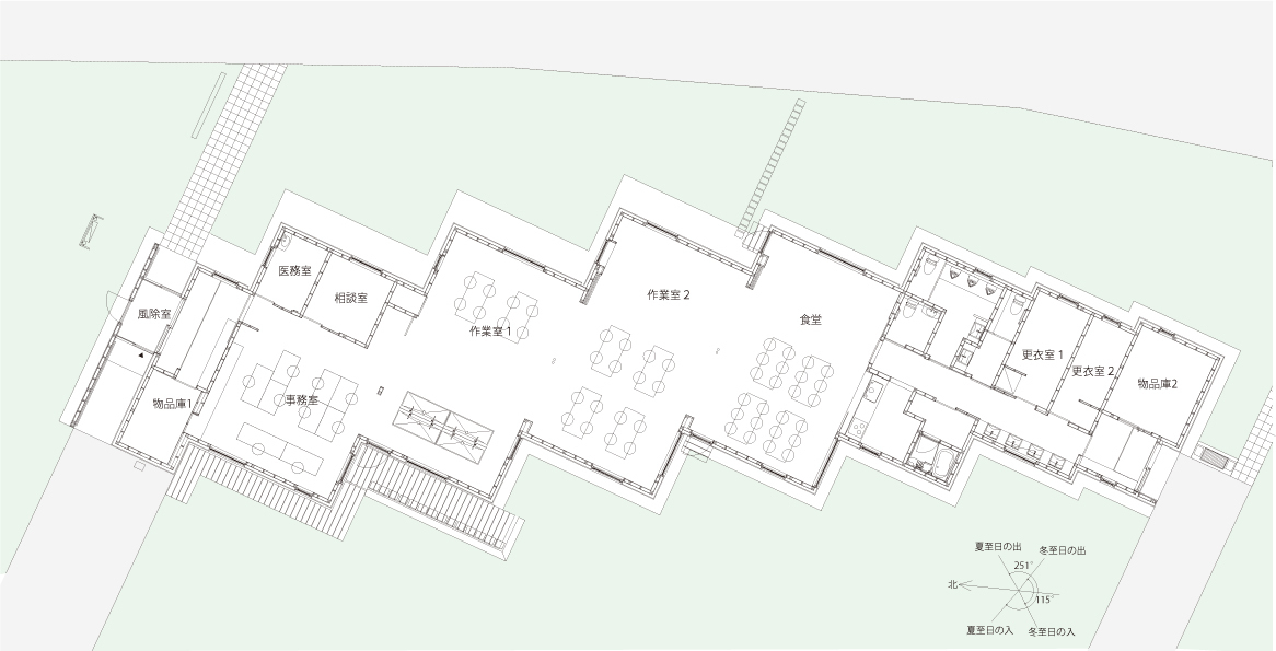 地域で障害を持つ青少年を守り育てることが求められています。豊富町で長年活動を続けているサロベツ福祉会は、近年、地域において利用者の就労の場を作り出すことに積極的に取り組み大きな成果を上げています。事業の展開と利用者数の増加、既存施設の老朽化を迎え、活動拠点となる本体施設の建て替えが決まりました。そこで、パンの製造販売、花の苗の育成販売、リサイクルなど町内各所で展開する活動をより理解してもらい、地域に受け入れられる建築を目指しました。また、心穏やかに作業を行える快適な室内環境、耐久性があり維持費の掛からないことも大切な条件でした。そこで次の建築的手法により実現を試みています。